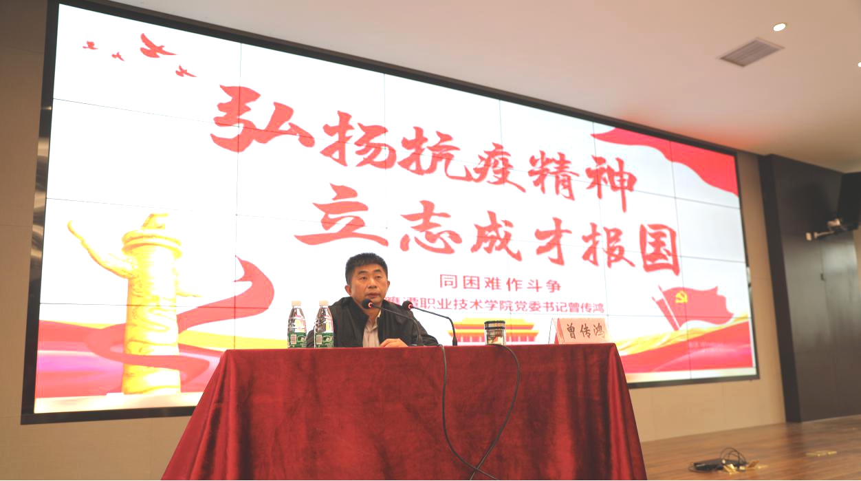 曾书记围绕伟大的抗疫精神、综观疫情爱祖国、致敬英雄赞模范、立志成才当报国四个方面,通过质朴的语言、鲜活的事例和详实的数据,深刻阐述了疫情发生以来,中国人民以坚定果敢的勇气和决心,经过艰苦卓绝的斗争,取得了疫情防控人民战争、总体战、阻击战的重大胜利,颂扬了在抗疫大战中孕育并诞生的“抗疫精神”。