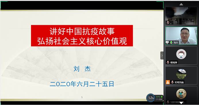 6月25日晚,校党委常委、副校长刘杰与环境学院和机电学院复研学生、毕业生相约 “云端”,讲授以《讲好中国抗疫故事——弘扬社会主义核心价值观》为主题的“返校复学第一课”。学工处副处长蒋怀柳、两个学院学工组全体老师、复研学生和毕业生近300人线上参与学习。