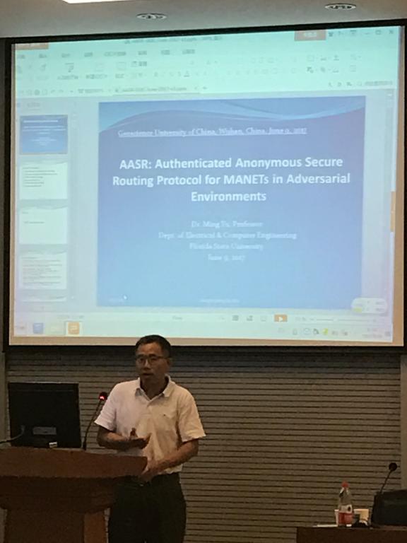 应pp电子官方网站院长丁华锋教授、科发院邀请,美国佛罗里达州立大学Ming Yu教授于6月9日来pp电子作题为“Authenticated Anonymous Secure Routing for MANETs in Adversarial Environment”的学术报告。