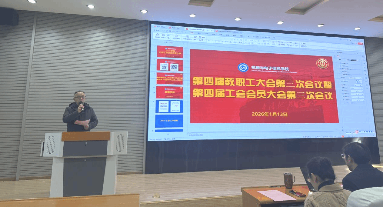 2026年1月13日下午4:00,第四届教职工大会第三次会议暨第四届工会会员大会第三次会议在教二楼 301报告厅继续召开,党委副书记吴迪主持会议,全体教职工参会。