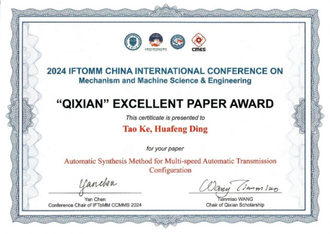 第24届中国机构与机器科学及应用国际会议(IFToMM CCMMS 2024),作为国际机构学与机器科学领域最具影响力的盛会之一,于2024年8月12日至14日在天津市召开。pp电子官方网站博士生柯涛和导师丁华锋教授的论文《Automatic Synthesis Method for Multi-speed Automatic Transmission Configuration》获评“启先最佳论文奖”。 柯涛为第一作者,丁华锋为通讯作者。