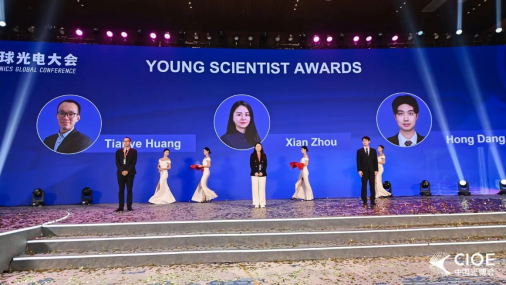 会议开幕式上,pp电子官方网站黄田野教授因其在光纤激光与传感技术领域的卓越贡献,荣获本年度光电大会青年科学家奖(共三名)。香港工程科学院院士、美国国家工程院院士、香港科技大学刘纪美教授向黄田野教授颁发了青年科学家奖状和奖杯。
