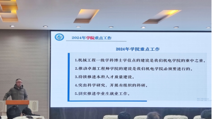 院党委书记瞿祥华做2024年度学院工作动员布置报告。报告围绕教育部2024年重点工作中的“8个重要工程”和“6个专项行动”,对照学校2024年重点工作展开,动员布置学院2024年将重点推进5个方面的工作:一是机械工程一级学科博士学位点的建设;二是卓越工程师学院的建设;三是持续推进本科人才质量建设;四是突出科学研究,开展有组织的科研;五是切实推进毕业生的就业工作。他强调,在面对新挑战时,学院全体教职工必须团结一心,每个人都要参与到学院改革和发展的轨道上,抓住新机遇,做强学院,取得新突破。