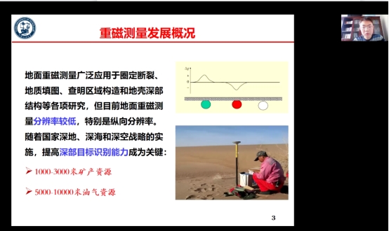 本次报告介绍井中重磁数据测量及正反演研究的进展。徐凯军博士回顾了井中重力和磁力测量的发展,重点介绍井中重力和磁力数据的数据探测、数据正反演。此外,徐博士通过一些实地探测项目,说明井中重力和磁力测量的高分辨率和在深部矿产资源勘探中的前景。报告结束后,徐博士与参会师生进行了交流,对大家提出的问题作出了针对性的回答。