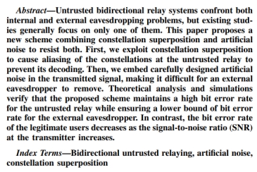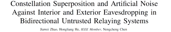 近日,pp电子官方网站通信系2022级本科生赵家伟以第一作者在IEEE国际知名期刊IEEE Wireless Communications Letters发表题为“Constellation Superposition and Artificial Noise Against Interior and Exterior Eavesdropping in Bidirectional Untrusted Relaying Systems”的学术论文。该论文提出了基于人工噪声的星座叠加技术,为双向中继系统对抗来自内部和外部的非法窃听提供了创新性解决方案。论文的指导教师为通信系特任副教授贺宏亮。