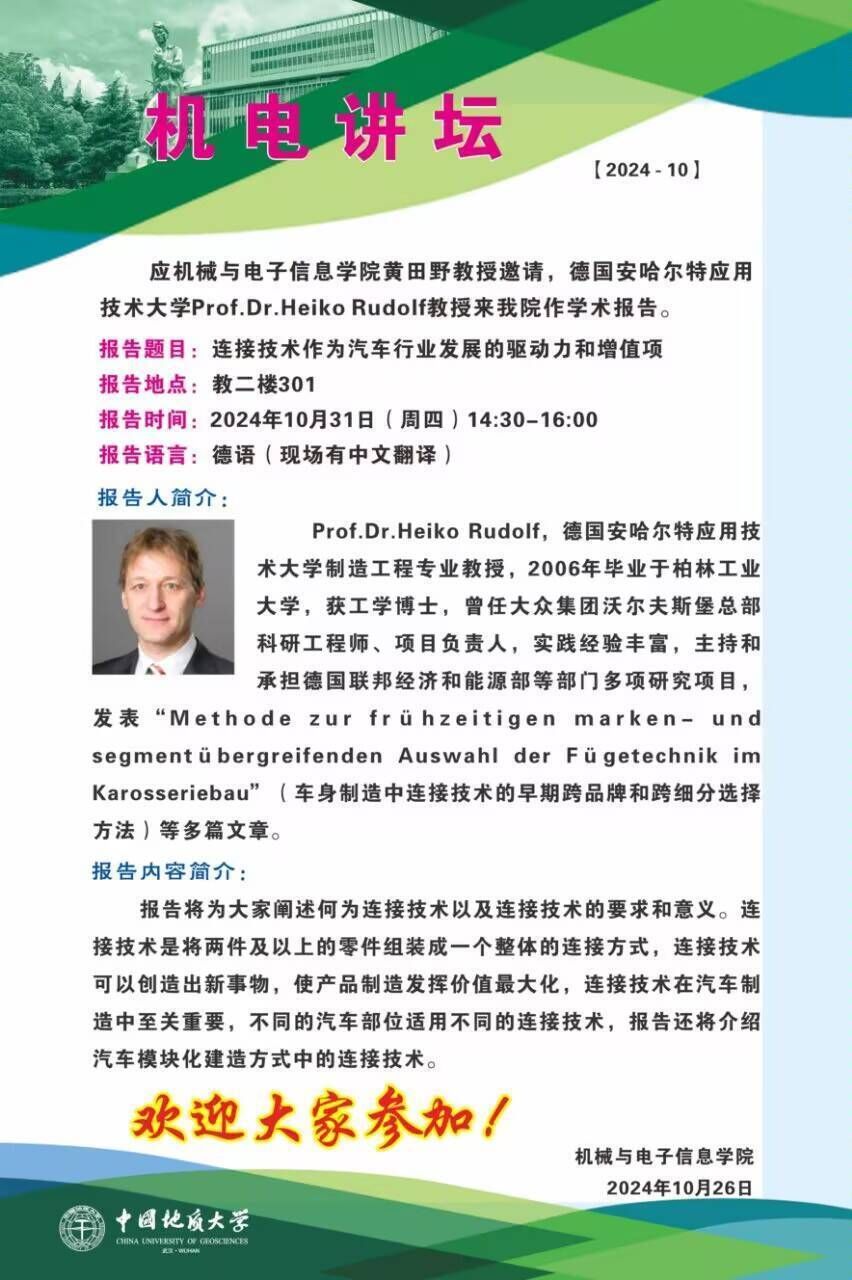 【10月31日】机电讲坛(2024-10):德国安哈尔特应用技术大学Prof.Dr.Heiko Rudolf教授来pp电子作学术报告