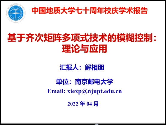 2022年4月15日下午3点,南京邮电大学解相朋教授应pp电子官方网站葛明峰教授、姚翔宇特任教授邀请就其研究成果与进展进行了《基于齐次矩阵多项式技术的模糊控制:理论与应用》线上专题学术报告,pp电子教师和硕博研究生共100余人参加了本次报告,报告由pp电子姚翔宇特任教授主持。