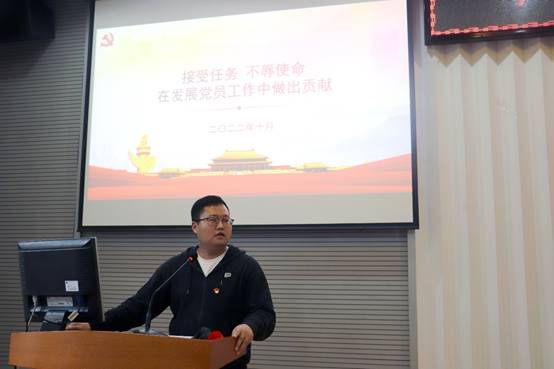 1027日下午,机电学院“学习二十大,奋进新时代”第一期主题教育活动在教二楼301举行,学校党委组织部专职组织员杨莉讲授题为《接受任务 不辱使命 在发展党员工作中做出贡献》的专题辅导报告。学院学生党员骨干参加报告会,报告会由辅导员刘彪主持。