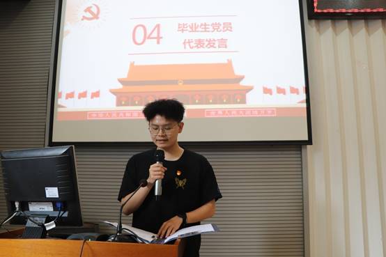 优秀毕业生党员代表赵皓楠同学代表全体毕业生党员发言。他结合自己追求政治进步“人生三部曲”的光荣历程,对党组织、师长的培养表达了感恩之情。她说道,在大学四年间,通过参与培训学习,投身各项志愿服务工作,不断修炼内功,走向成熟。在未来的工作生活中,将自觉接受社会监督和磨练,坚定前进信心,牢记党的教诲,立志民族复兴,不负韶华,不负时代,不负人民,在青春的赛道上奋力奔跑,争取跑出当代青年的最好成绩。