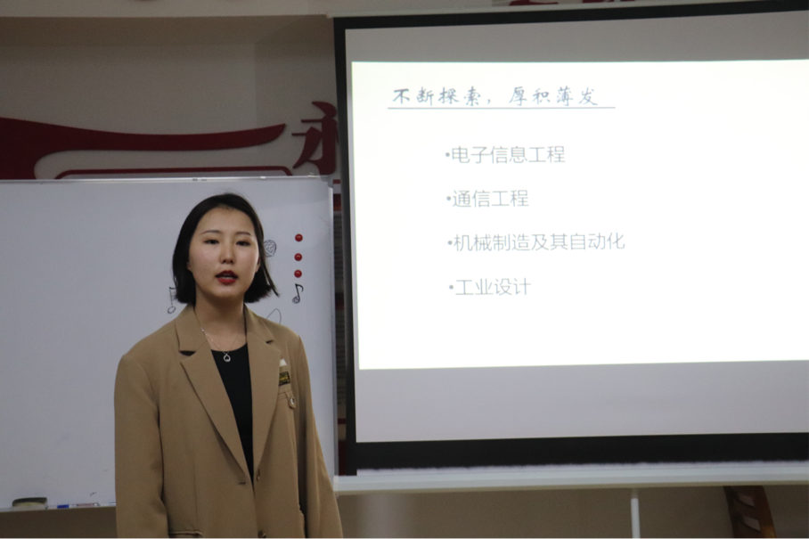 现任17级毕业生委员会就业促进负责人的巴都木才次克进行题为《如何在毕业季成为平平无奇“求职小天才”》的报告。都木针对到场同学们所学专业,简要介绍了各专业可能的就业方向。同时,她以各专业可就业的公司为切入点,列举了一些自己在双选会中挑选出的公司进行了展开介绍。随后,都木建议同学们应该问问自己“喜欢什么?好奇什么?”,由此来确定适合自己的行业和岗业。她特别分享了自己的小技巧:整理,列出自己做过的事,包括课程作业、实习、学生工作等,再来明确自己求职方向。接着,都木展示了求职的时间线,并结合自身求职经历进行了介绍。最后,她对18级准备求职的同学进行了鼓励,希望大家“不断尝试,厚积薄发”。
