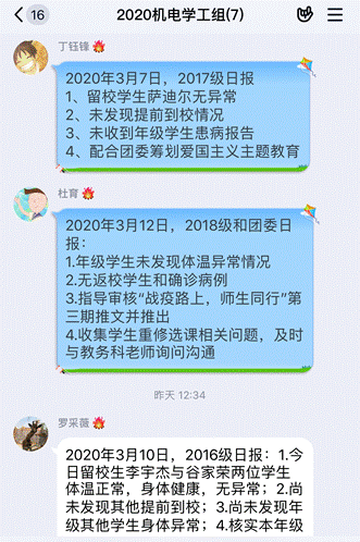 “疫情就是命令,防控就是责任”。学院党委第一时间成立了抗击肺炎疫情工作领导小组,全院教职工严格落实疫情防控各项要求,学工组迅速启动应急工作机制,全体辅导员坚守工作岗位,联合本科生班主任、研究生导师关注全院2000余名学生居家生活、学习状况,形成了“学院-年级-班级”的有效工作机制;为落实“日报告、零报告”制度,建立起学生体温监测“线上”组织网,全天候关注留校学生、返乡学生动态。师生协调配合凝聚起疫情防控行动向心力。
