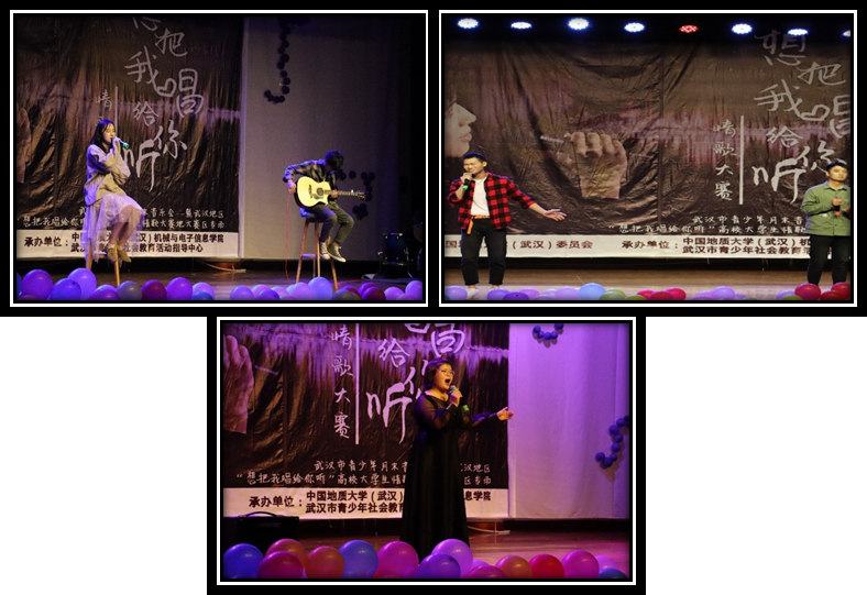 比赛在机电舞蹈队《BAAM》的激情热舞中拉开了序幕。11组选手按照赛前抽签结果,分为AB两组依次进行首轮献唱。选手们有自弹自唱的、有乐队伴奏的、有陶醉的“李健”、也有高音“李谷一”……选手们精彩的表演引得现场观众欢呼声、掌声不断,正如现场的同学感言:“这真称得上是‘地大好声音’。”