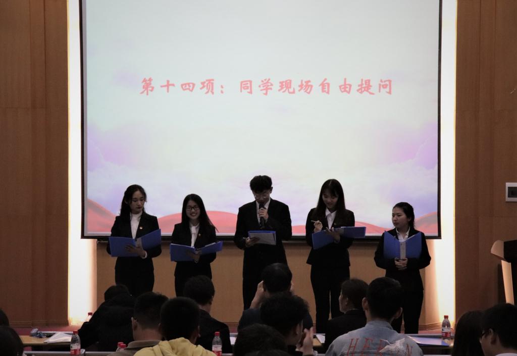大会第十二项,2019届主席团预选候选人进行答辩。1号候选人闫樨霖,她认为学生会主席团有沟通桥梁的作用,提倡要提前培养有理想有才干的同学,建立好活动反馈机制,建议学术部开展有机电学院专业特色的活动。2号候选人周子璇,她提倡优化学风建设和内部建设,完善制度、规范动作,要落实考核方案以保证工作质量,广泛收集同学们的意见和建议,开展学术分享会。3号候选人单博阳,他希望可以打造部门品牌活动,并积极去外出调研,学习外校的优点,沉淀自身的文化。4号候选人张依依,她提出通过设立优秀人物专栏,向学生推荐学习对象,营造科技文化氛围,加强人才培养,定期进行副部头脑风暴。5号候选人孙灿,她认为学生会是一棵树,每一部分都是有机的联系,并提出优化学术环境,创办学术电子周刊,扩大情歌大赛等活动的受众面。