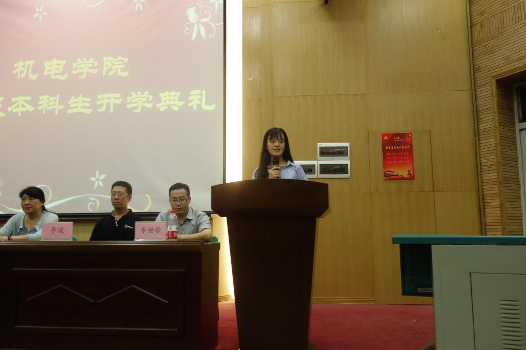 院长丁华讲话。他从机电学院历史沿革、现阶段师资力量、教学成果、科研方向、科研成果、人才培养计划等方面向新生介绍了机电学院。并希望大家能够珍惜时间、刻苦学习,做到品德高尚、基础厚实、专业精深、知行合一。